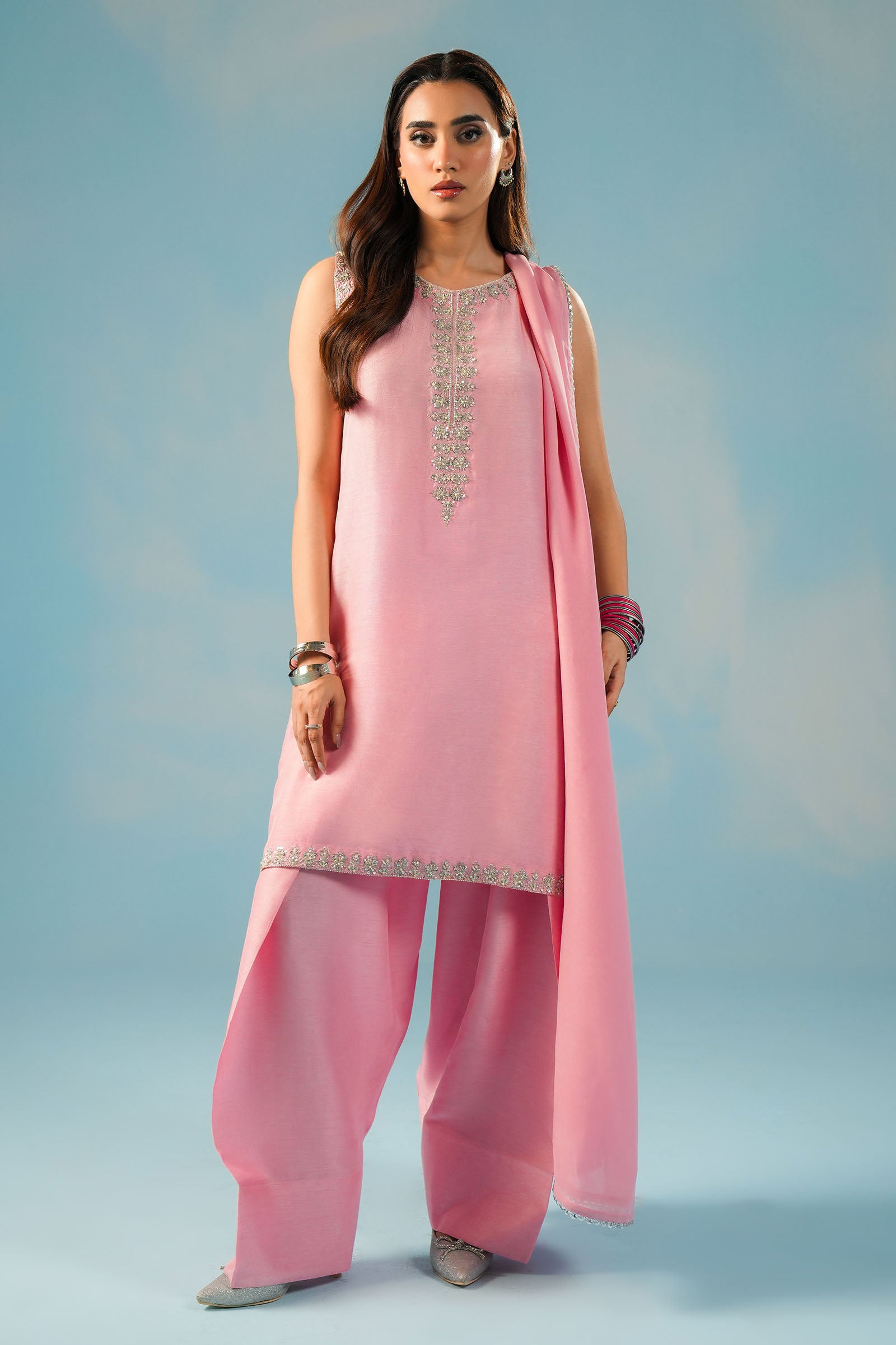 Description: Soft blush tones meet intricate handwork in this dreamy raw silk ensemble. With delicate embellishments, a teardrop cutout, and a flowy farshi shalwar—this look is perfect for festive evenings and intimate celebrations.