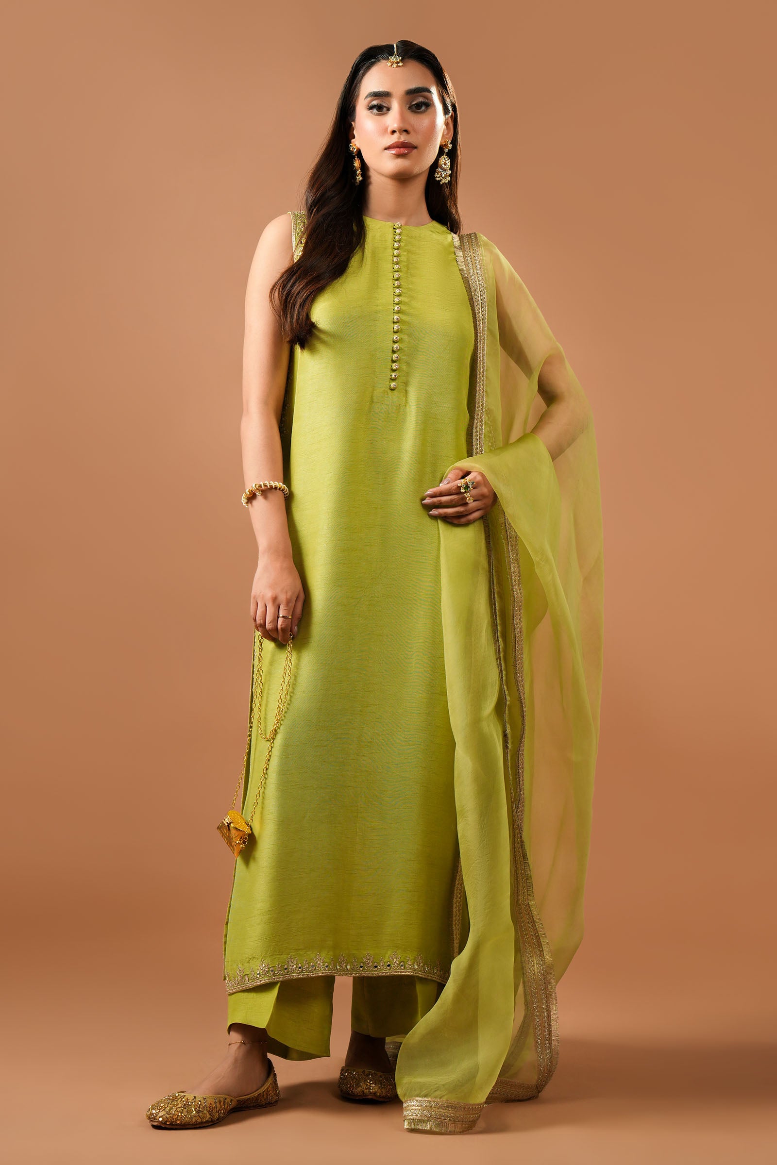 Description: A vibrant lime green ensemble in Korean raw silk, detailed with buttons and subtle sparkle. Paired with a breezy organza dupatta, it’s your go-to for festive summer elegance.