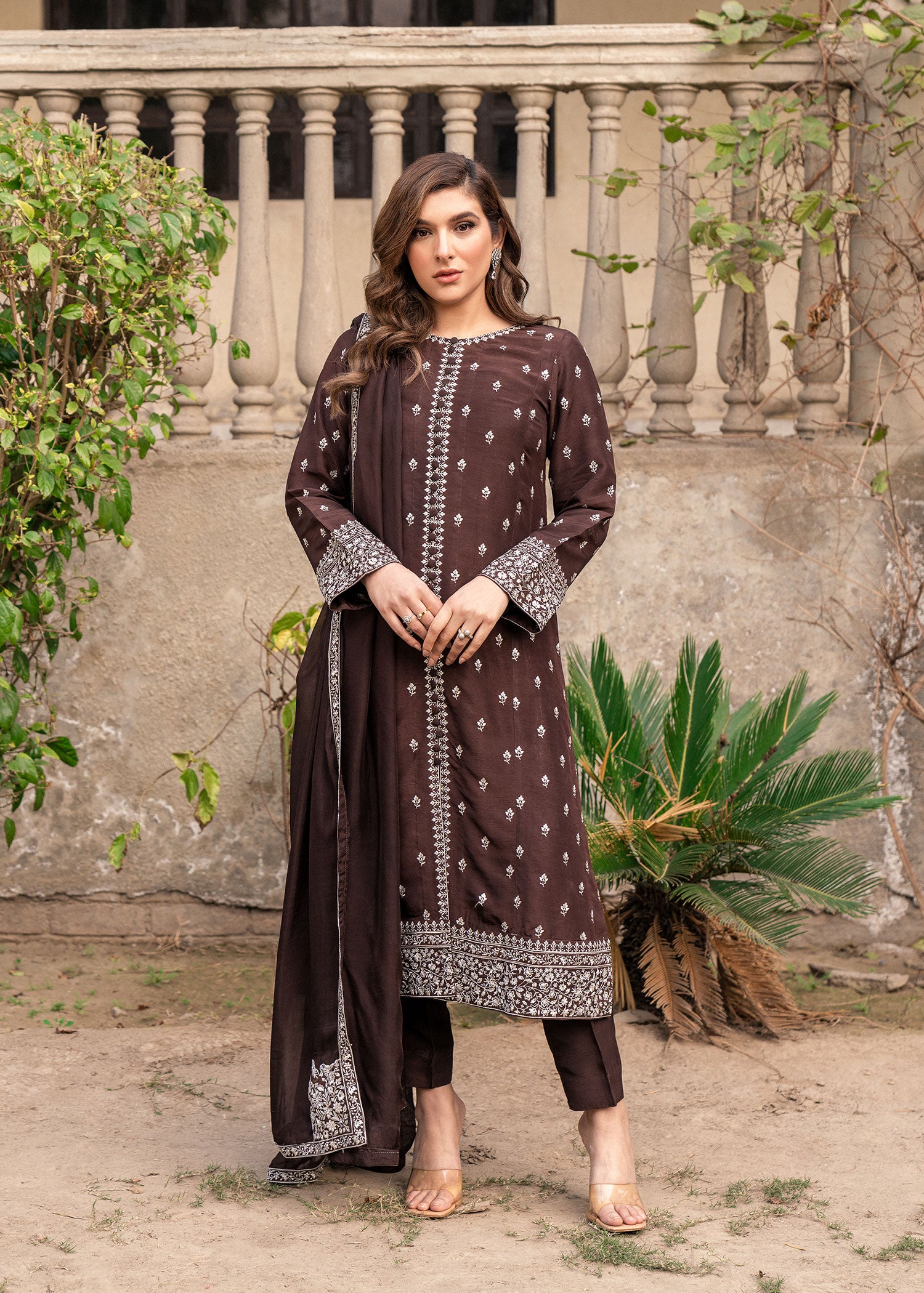 Embodying glamour, this outfit is a true showstopping piece. Crafted on luxurious silk, the deep brown shirt features intricately arranged resham embroidery. Paired with a silk shalwar and a daintily embroidered silk dupatta, this set is the perfect contemporary-classic piece,making it a versatile choice for your festive occassions.